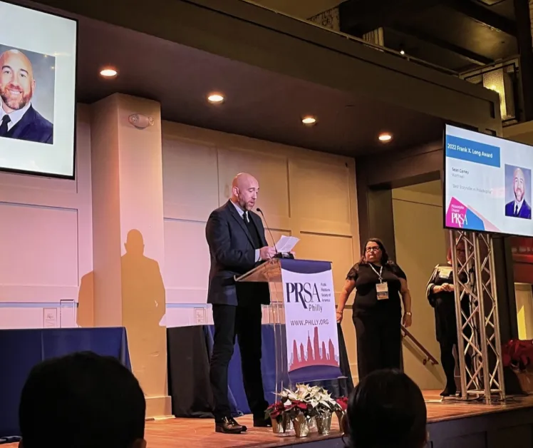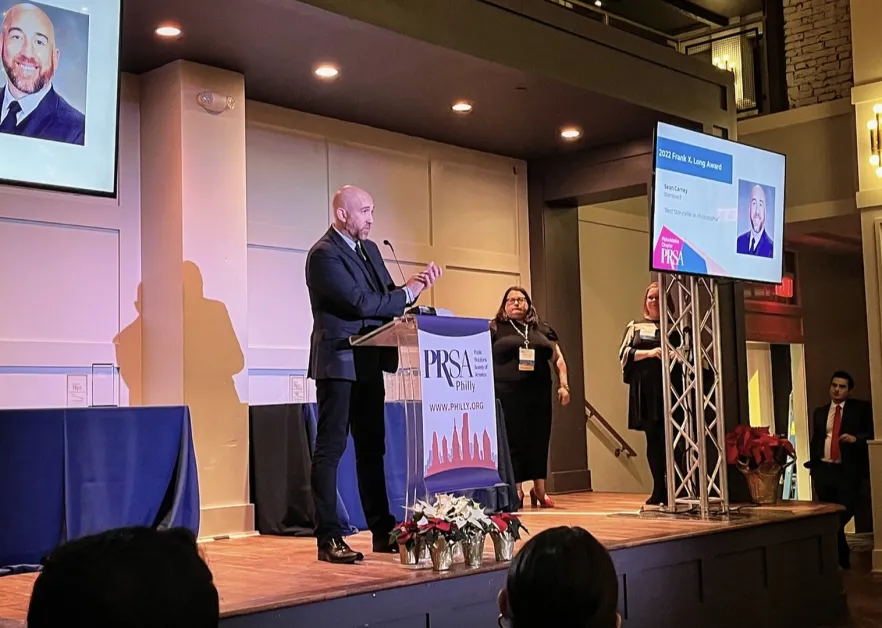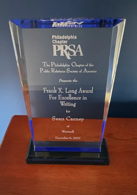 December 6, 2022 (Philadelphia) — Wentwell CEO Sean Carney was presented the Frank X. Long Award for Excellence in Writing by the Philadelphia chapter of the Public Relations Society of America (PRSA). During an event attended by top communications practitioners from across the region, Sean reflected on his nearly two-decade career as a writer and offered insights for the future of the industry.